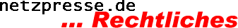Dieses Angebot wurde mit größtmöglicher Sorgfalt zusammengestellt. Nach menschlichem Ermessen sind Fehler dennoch nicht auszuschließen. Für eventuelle Schäden, die sich aus der Nutzung dieser Seiten ergeben, wird ausdrücklich keine Haftung übernommen. In der Netzpresse wird auf fremde Domänen verlinkt. Der Sinn der Links besteht darin, den Anwender auf externe Informations-Ressourcen zu verweisen. Beachten Sie, dass dort die Richtlinien und Copyrights der jeweiligen Anbieter gelten. Diese Angebote liegen außerhalb der redaktionellen Verantwortung der Netzpresse. Die Redaktion der Netzpresse hat die Seiten bei der erstmaligen Verlinkung gewissenhaft auf deren inhaltliche Qualität überprüft. Nach dem Teledienstegesetz kann sie jedoch nicht dazu verpflichtet werden, die verlinkten Inhalte ständig auf Veränderungen zu überprüfen. Dies gilt insbesondere auch für strafbare Inhalte auf externen Angeboten. Gleichwohl bemühen wir uns, die Links aktuell zu halten und im Rahmen der redaktionellen Möglichkeiten wiederholt auf ihre Qualität und rechtliche Unbedenklichkeit zu überprüfen. Für die Verfügbarkeit der externen Angebote kann allerdings keine Garantie übernommen werden. Sollten durch die Verlinkung oder die Bereitstellung von Suchformularen irrtümlich Rechtsansprüche verletzt werden, benachrichtigen Sie bitte sofort den Webmaster, damit diese Links enfernt werden. | ||